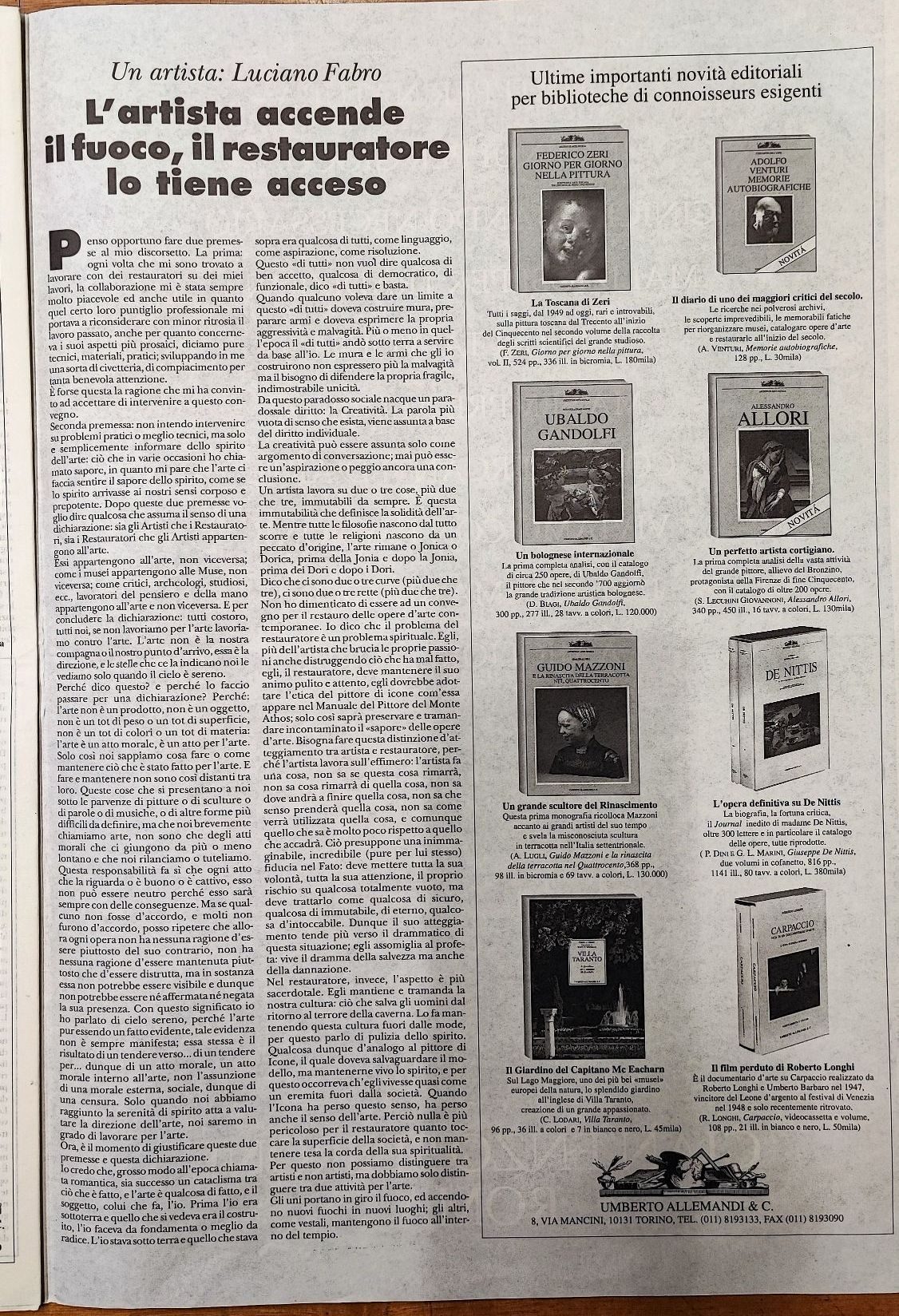 Ho riletto un articolo apparso sul numero speciale del “Giornale dell’ Arte” negli anni novanta che gentilmente mi ha fornito la biblioteca Angelo Maj di Bergamo. Le pagine fanno parte di un lungo articolo dedicato al restauro in cui interviene l’ artista Luciano Fabro. E’ sorprendente l’attualità delle sue tesi. Egli dichiara: “Sia gli Artisti che i Restauratori, sia i Restauratori che gli Artisti appartengono all’arte. Essi appartengono all’arte, non viceversa; come i musei appartengono alle Muse, non viceversa; come critici, archeologi, studiosi ecc., lavoratori del pensiero e della mano appartengono all’arte e non viceversa. E per concludere la dichiarazione: tutti costoro, tutti noi, se non lavoriamo per l’arte lavoriamo contro l’arte. L’arte non è la nostra compagna o il nostro punto d’arrivo, essa è la direzione, e le stelle che ce la indicano noi le vediamo solo quando il cielo è sereno. Perché dico questo? E perché lo faccio passare per una dichiarazione? Perché: l’arte non è un prodotto, non è un oggetto, non è un tot di peso e un tot di superficie, non è un tot di colori o un tot di materia: l’arte è un atto morale, è un atto per l’arte.” Di seguito è possibile leggere l’articolo completo.
